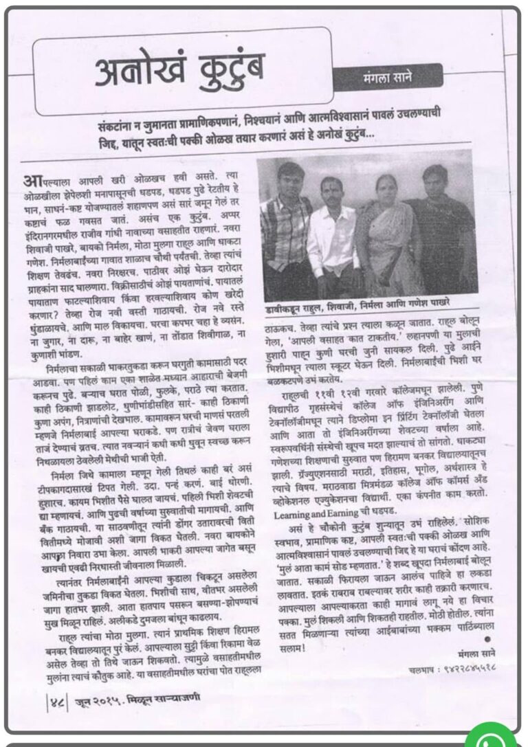 “ मिळूनी साऱ्या जणी “ या प्रसिद्ध मासिक मध्ये आमच्या कुटुंबाची संघर्षात्मक प्रवासाची माहिती प्रसिद्ध केली .